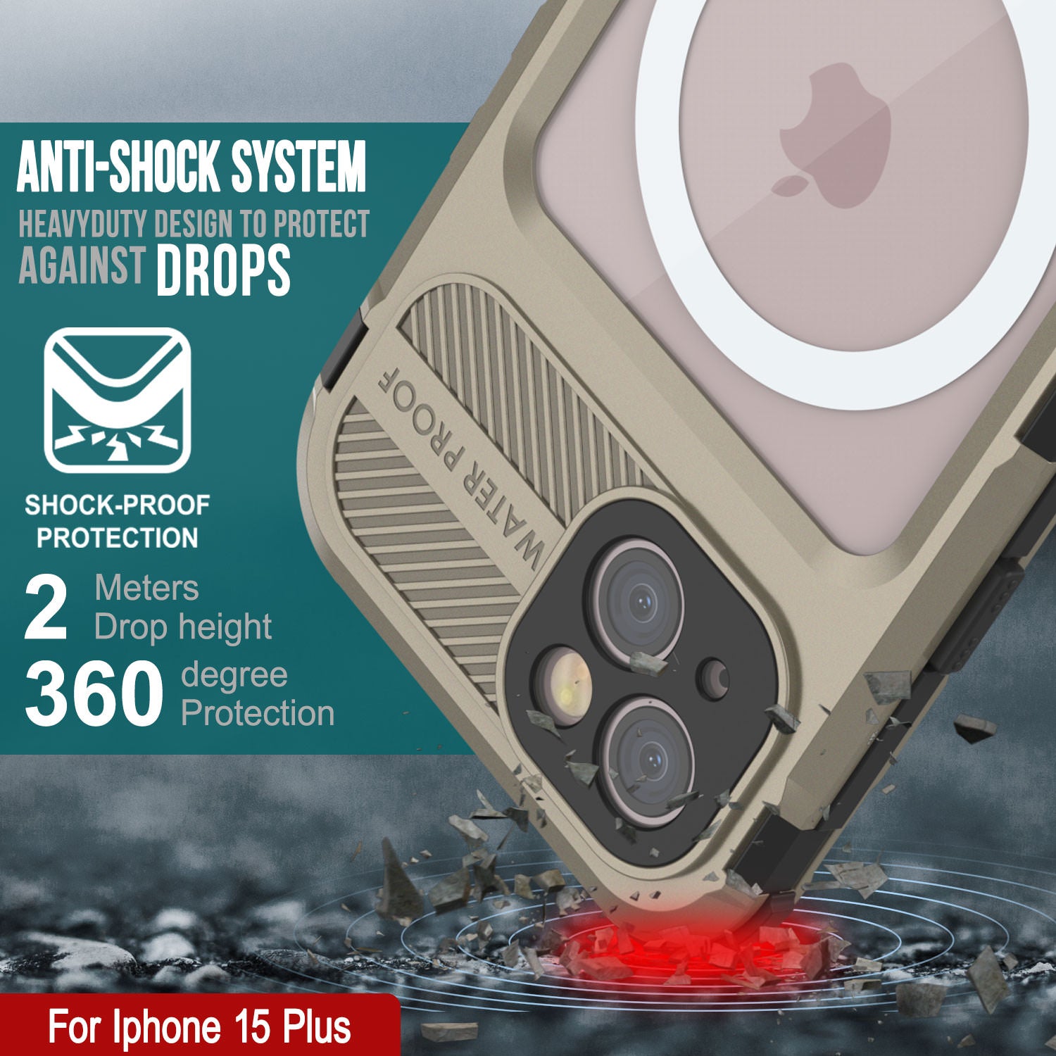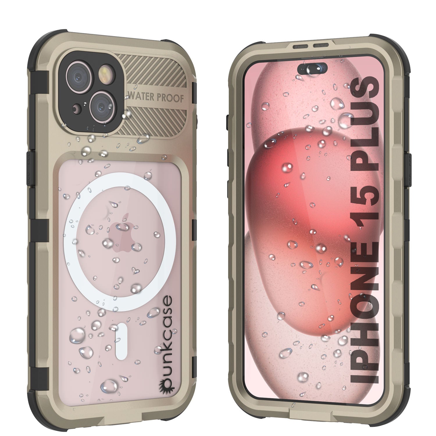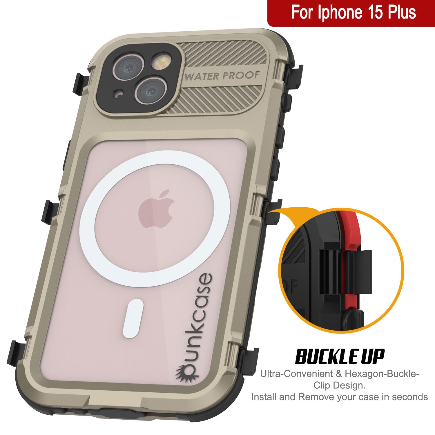 iPhone 15 Plus Metal Extreme 2.0 Series Aluminum Waterproof Case IP68 W/Buillt in Screen Protector [Gold]