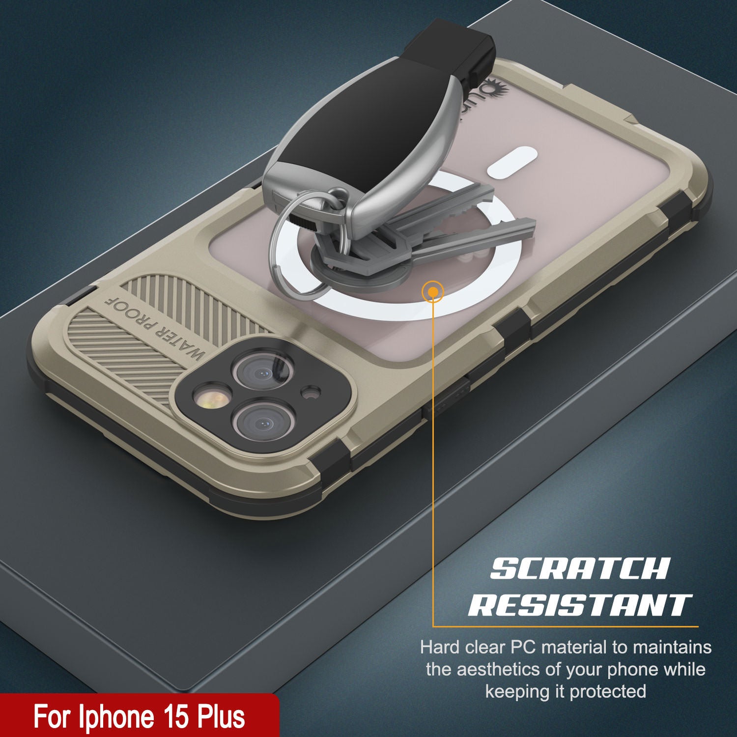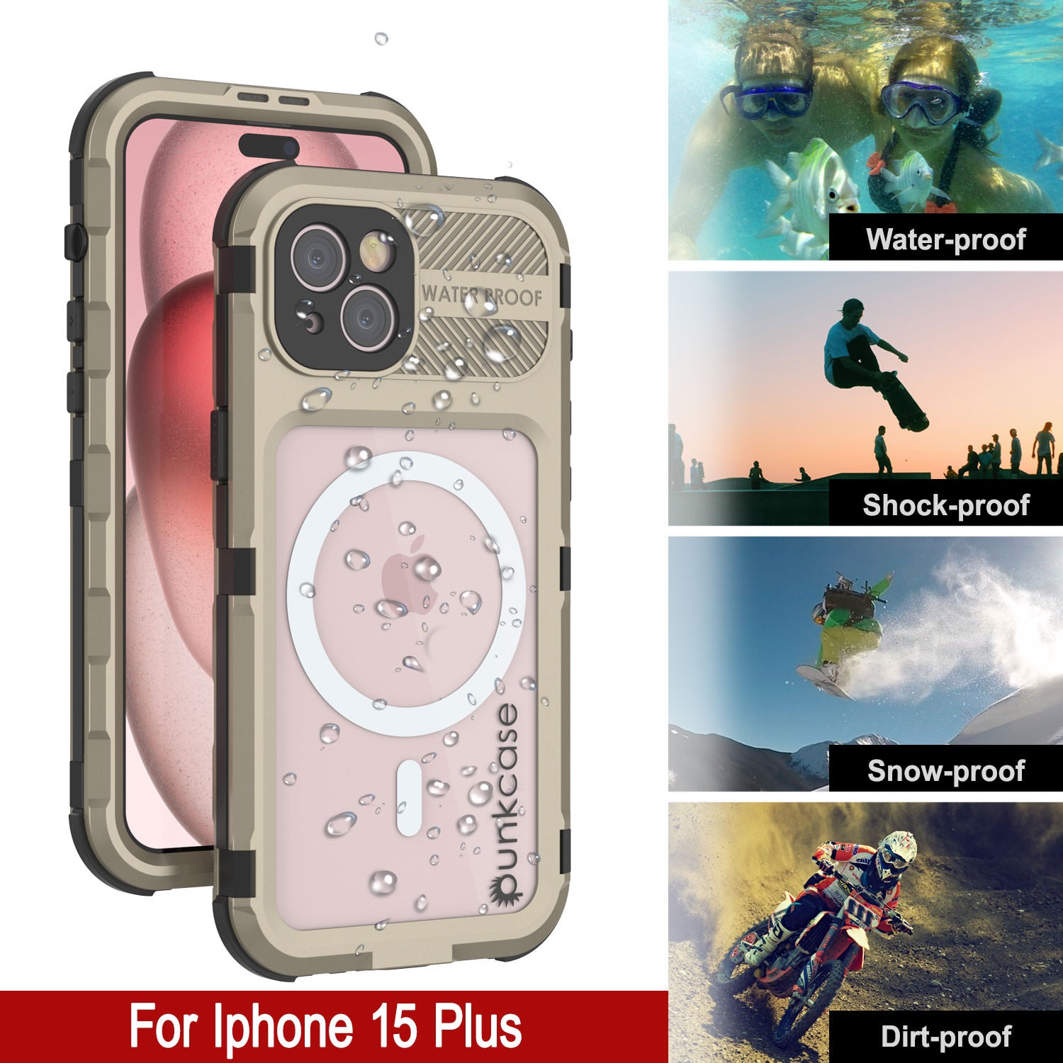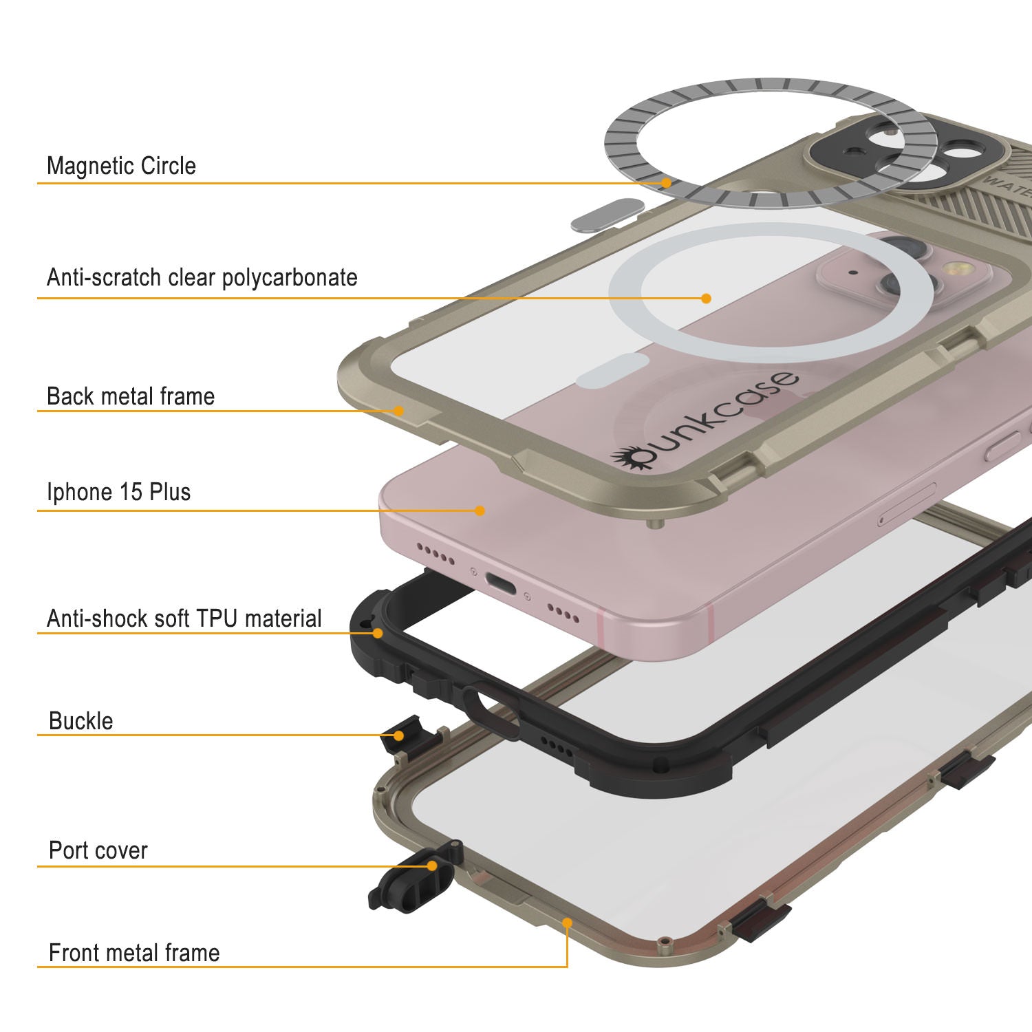 iPhone 15 Plus Metal Extreme 2.0 Series Aluminum Waterproof Case IP68 W/Buillt in Screen Protector [Gold]